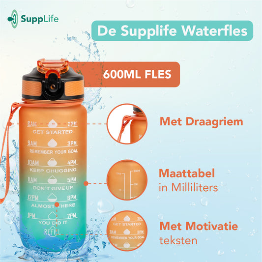 Supplife Motivatie Waterfles Oranje Cyaan - 600 ml